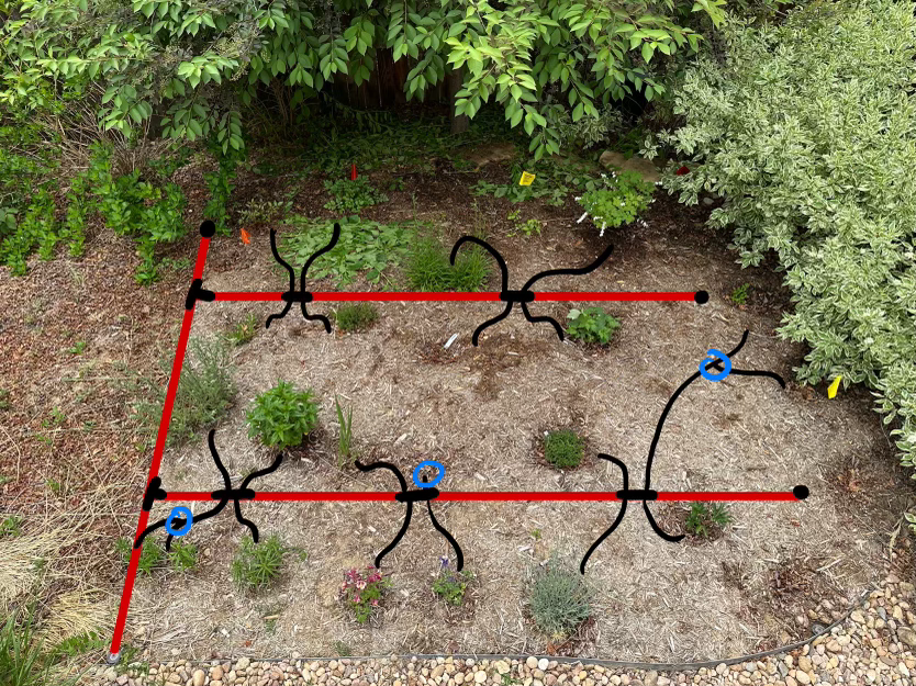 8x rainbird caps 1x rainbird drip converter 1/2” tubing (20ft?) 1/4” tubing (how much?) 2x 1/2” T-joint 3x 1/2” end cap 1x from kit 2x 5x 1/2” 6-way connector 4x from kit 1x 2x 1/4” T-joint 1x 1/4” cap