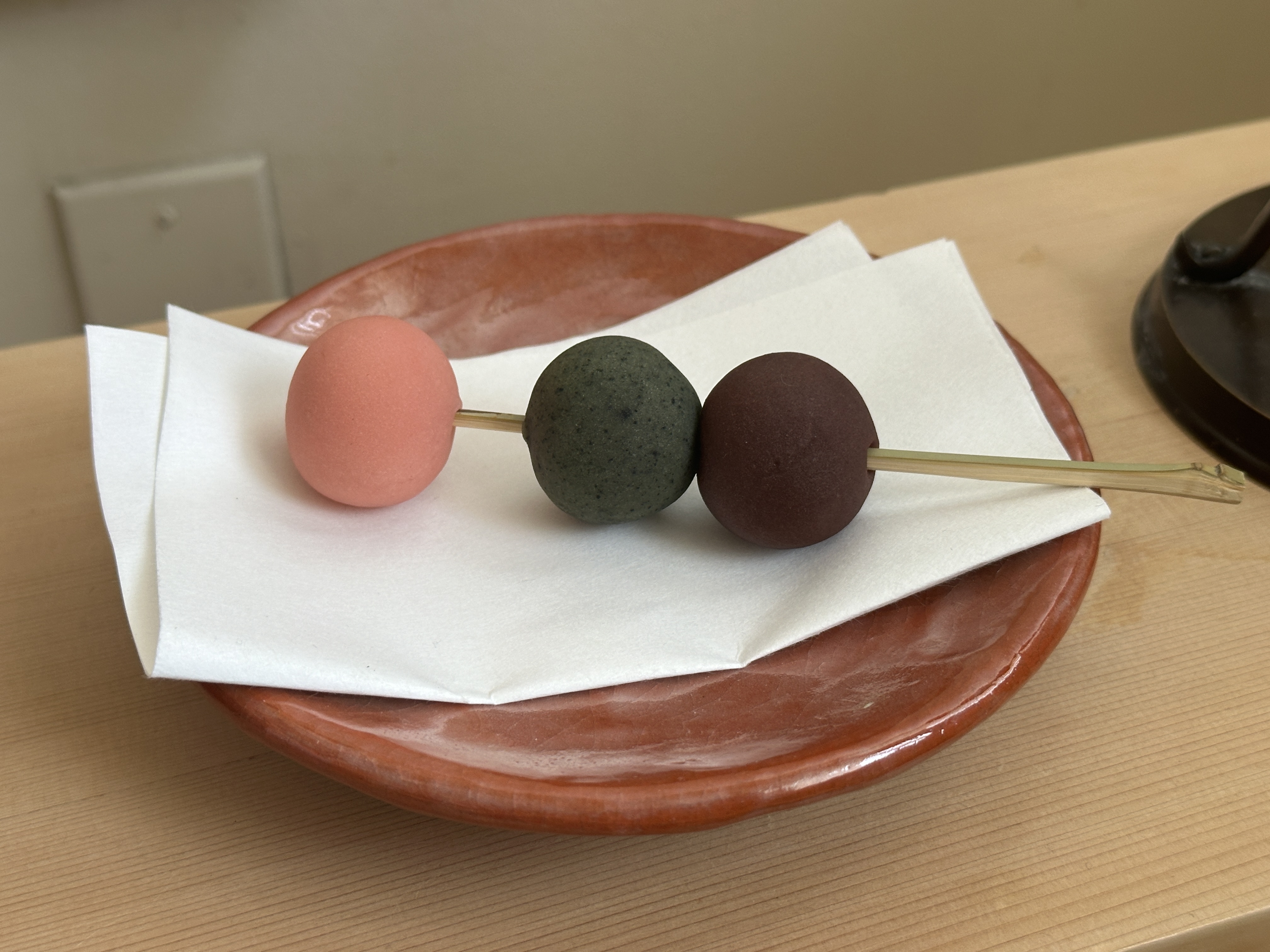 - brown closest to hand, then green, then small space (for dango-bako), then pink. Urasenke does brown, but most of Kyoto does white. He doesn’t know how the brown started