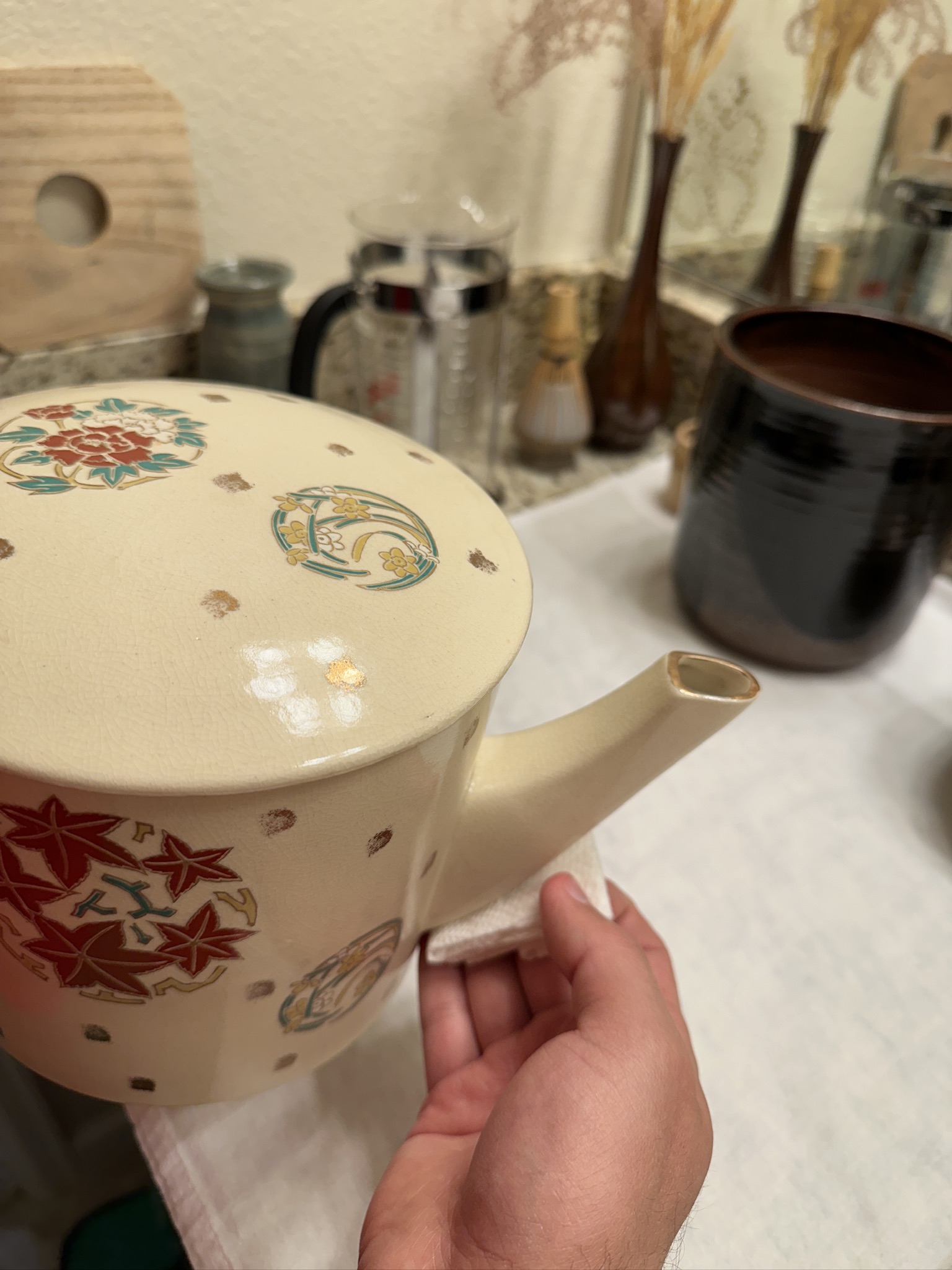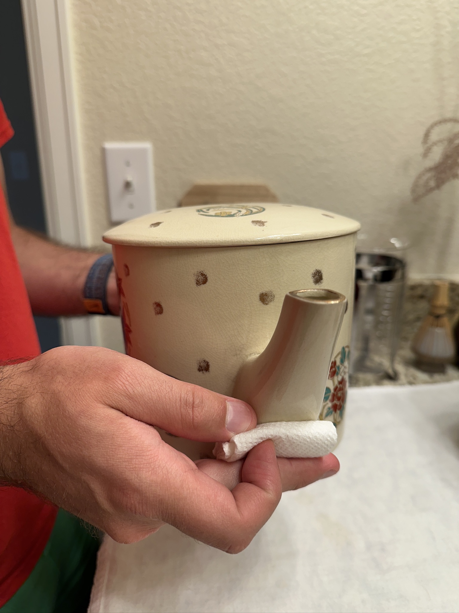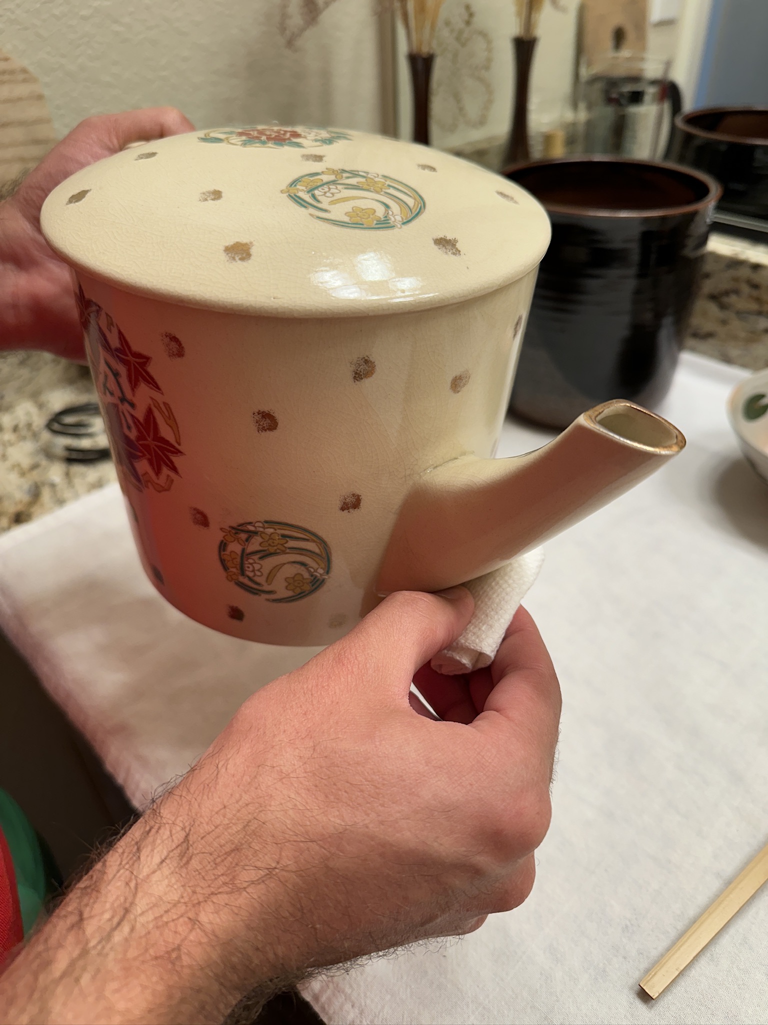 - His preference is to hold the corner of the chakin with your thumb and index finger, then extend your other three fingers out straight and use them to support the spout.