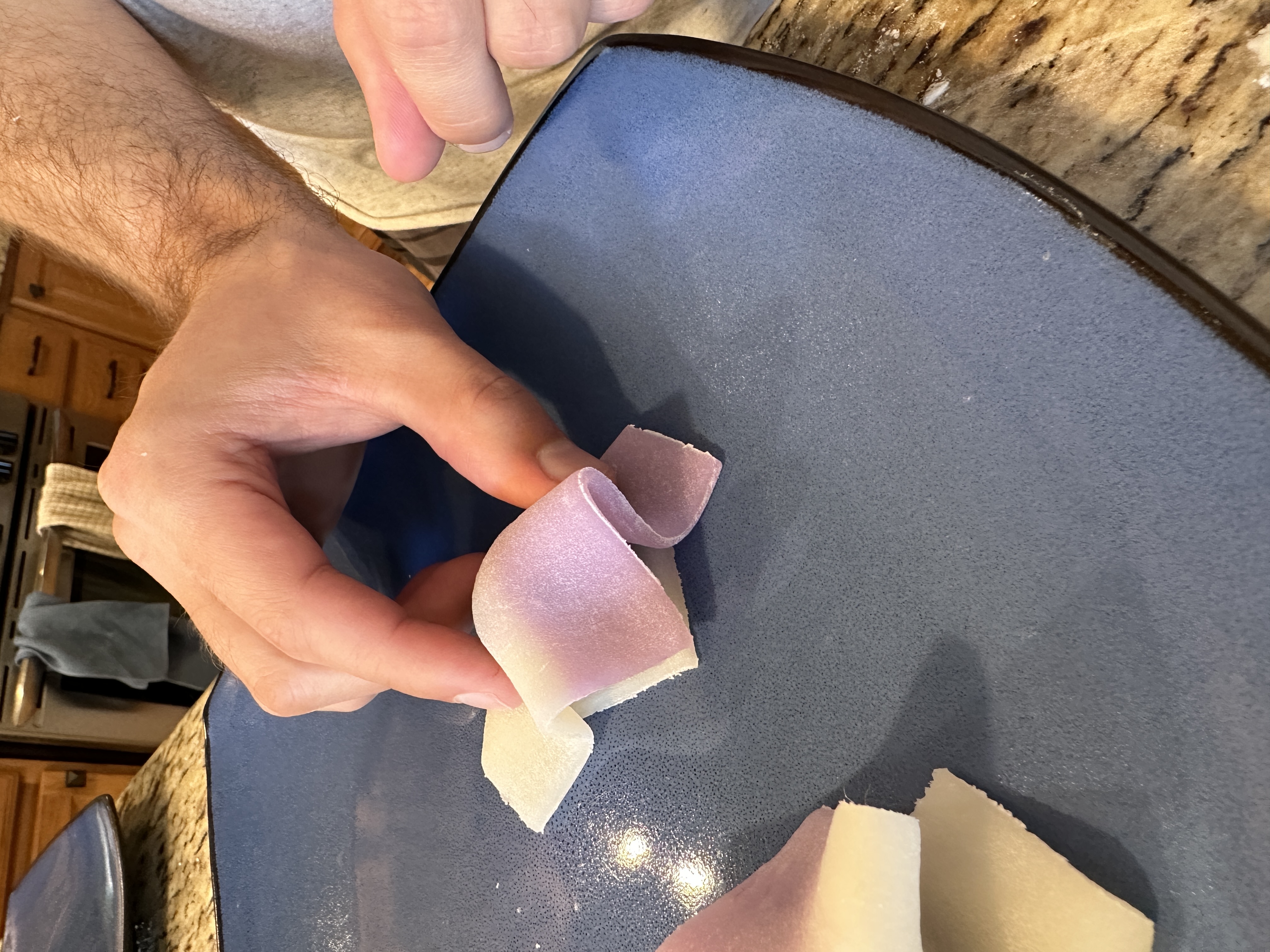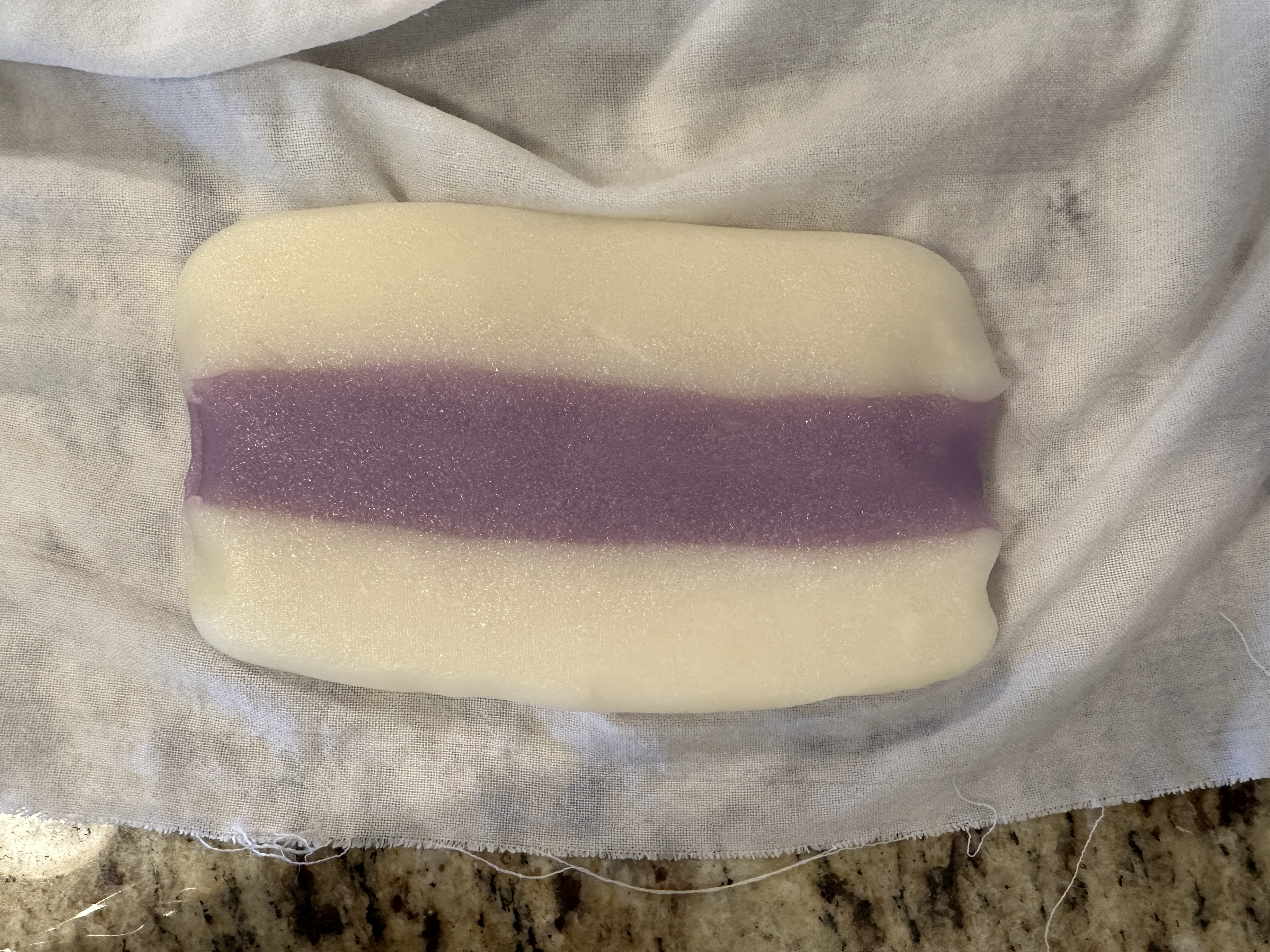 Also, listen to yourself below when you say to do hot dogs in thirds. When you trim the edges, what you necessarily end up trimming is the outside, which is the white. If you start with the white equal in proportion to the purple, the purple will dominate after trimming. Just do 1/3 purple, leaving white in the majority. Then, when you cut, it will end up even.
