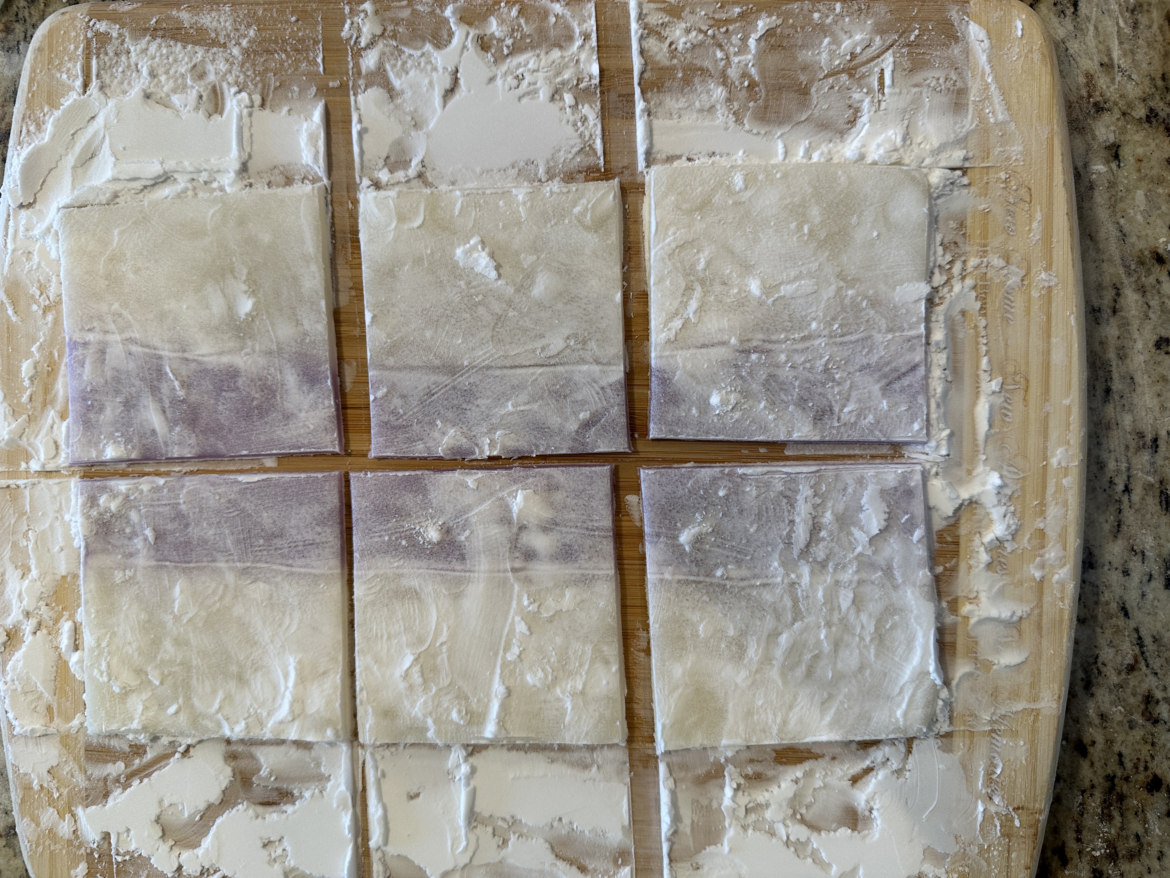 - After rolling out a rectangle, trim the edges to have a clean line. Then, cut down the middle length-wise to produce two long, 8cm wide sheets with purple on the edge.