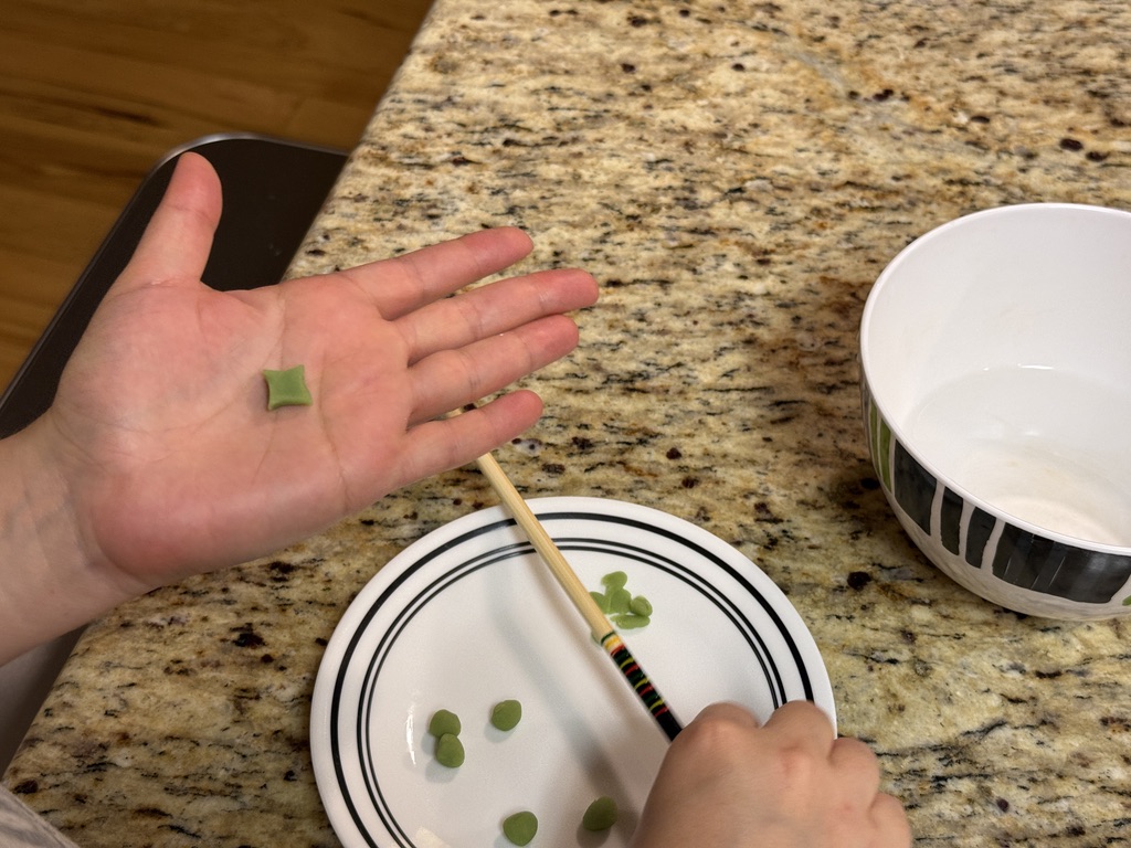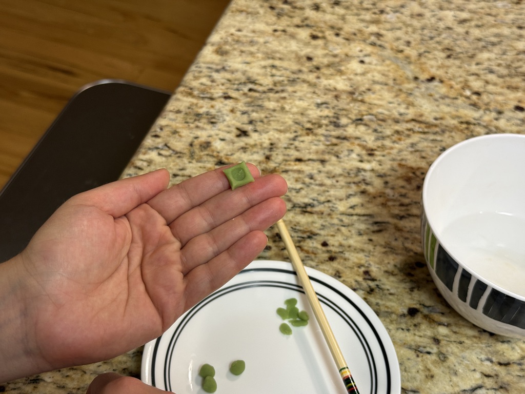 - Flatten a small ball of konashi, then pinch the four corners.