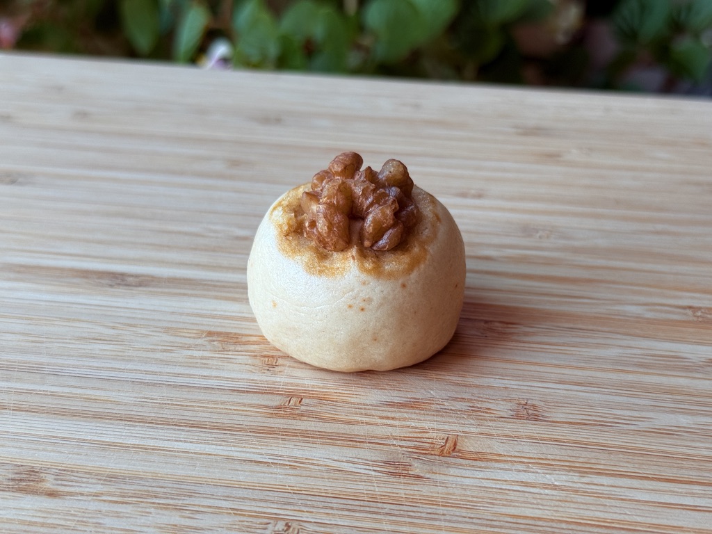 - (In order to firmly attach the walnut, it must be slightly indented into the dough. Just setting it on top will not be enough to attach it in the final product. On the other hand, pushing the walnut too deeply into the dough makes it ugly.)