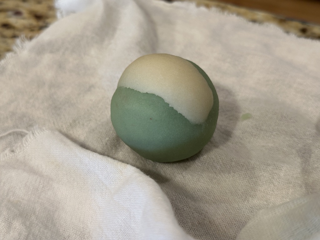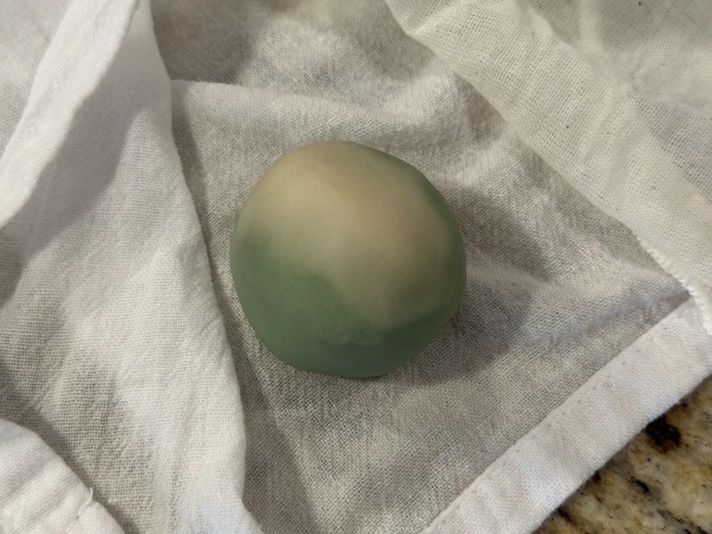 - Roll the white into a hot dog, then pre-flatten it, then place on top of the ball.
