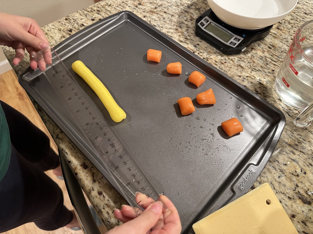 - Use a bench scraper to cut the uiro into pieces. If you cut pieces too big or too small, uiro tolerates adding more material and re-kneading well.