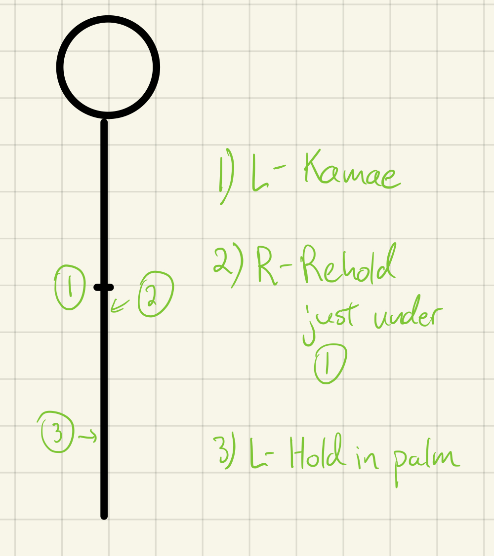 - Placing down: L thumb on fushi, R slightly below, rehold into L, place down.